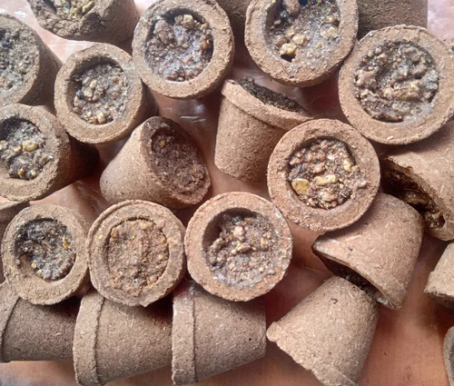Eco-friendly cow-dung products including dhoop, havan samagri, cakes and natural seedling pots.